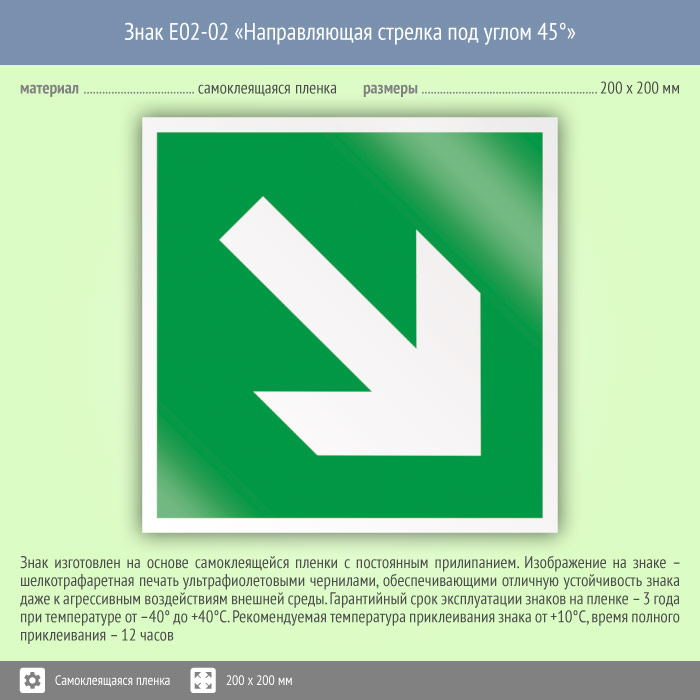 Знак «Направляющая стрелка под углом 45°» обозначает направление эвакуации – вниз или наверх. Код знака: E02-02