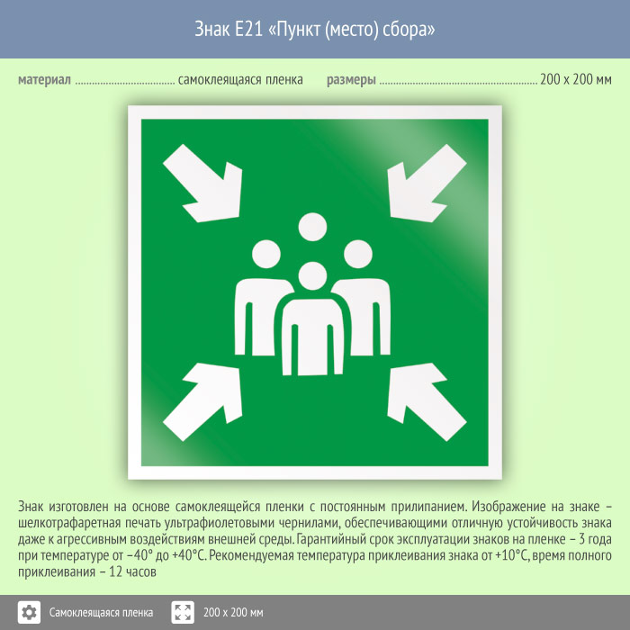 Знак «Пункт (место) сбора» обозначает место и пункт сбора во время эвакуации. Код знака: E21
