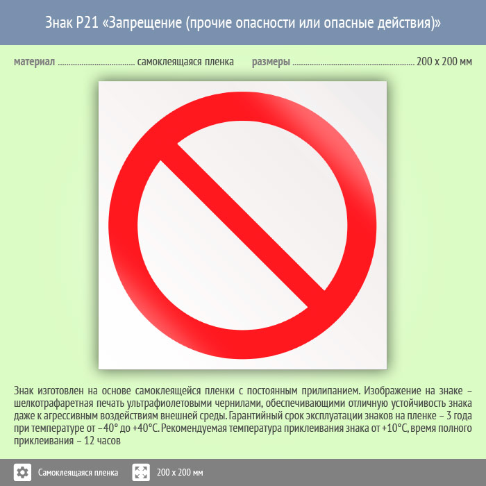 Знак «Запрещение (прочие опасности или опасные действия)» запрещает все или разрешает ничего – обычно идет с поясняющей надписью. Код знака: P21