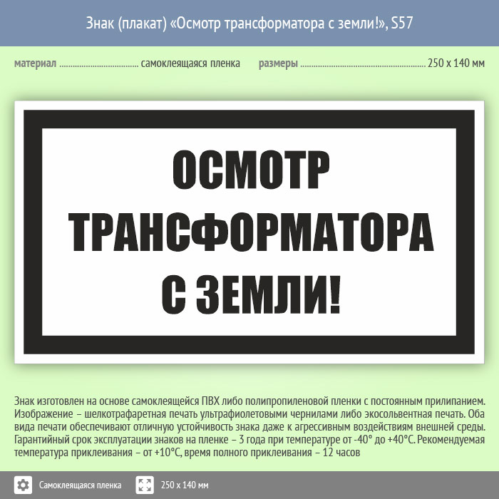 Знак «Осмотр трансформатора с земли!» может быть изготовлен любого размера на самоклеящейся пленке, пластике толщиной 0.5, 2 или 4 мм и металле. Также возможно применение фотолюминесцентных и световозвращающих материалов