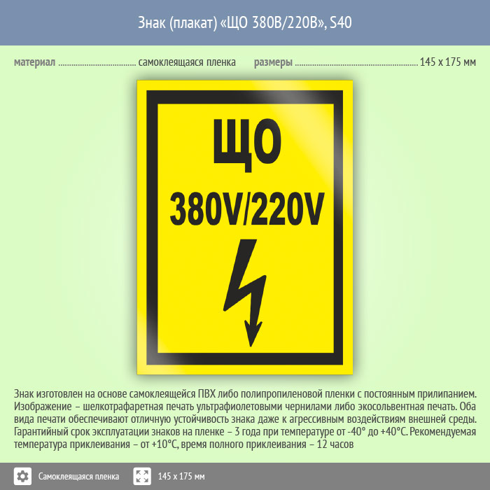 Табличка «ЩО 380В|220В» размещается на щитах освещения с напряжением 220 – 380 вольт. Код знака: S40