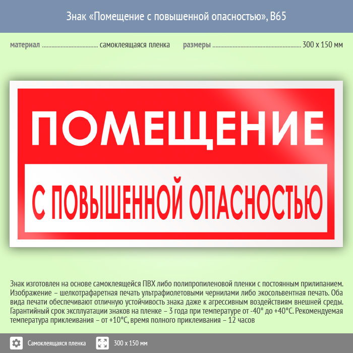 Знак «Помещение с повышенной опасностью» может быть изготовлен любого размера на самоклеящейся пленке, пластике толщиной 0.5, 2 или 4 мм и металле. Также возможно применение фотолюминесцентных и световозвращающих материалов