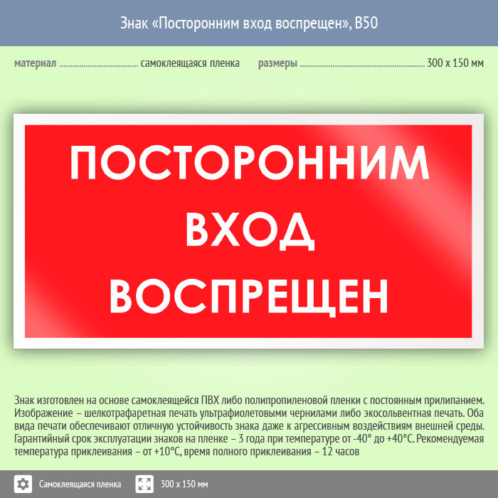 Знак «Посторонним вход воспрещен» имеет размер 300х150 мм