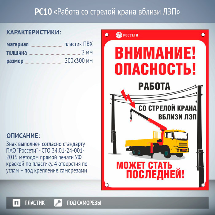 Знак «Работа со стрелой крана вблизи ЛЭП», РС10 (пластик 2 мм, 200х300 мм, отверстия под саморезы)