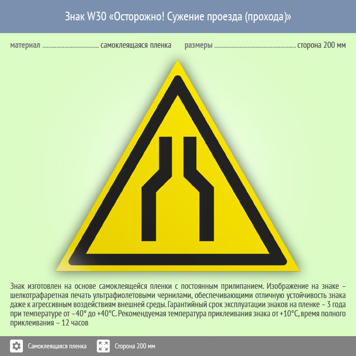 Знак «Осторожно! Сужение проезда (прохода)» может быть изготовлен любого размера на самоклеящейся пленке, пластике толщиной 0.5, 2 или 4 мм и металле. Также возможно применение фотолюминесцентных и световозвращающих материалов