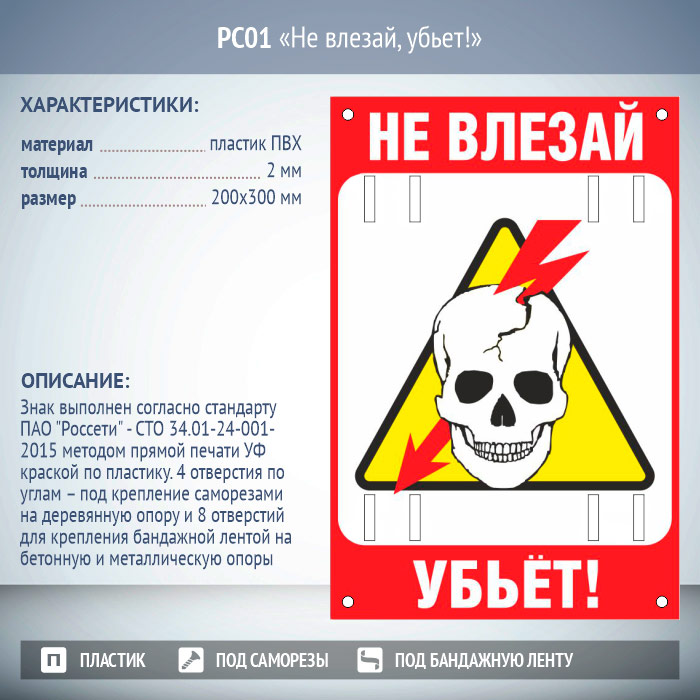Знак «Не влезай, убьет!», РС01 (пластик 2 мм, 200х300 мм, отверстия под бандажную ленту) в Великом Новгороде купить