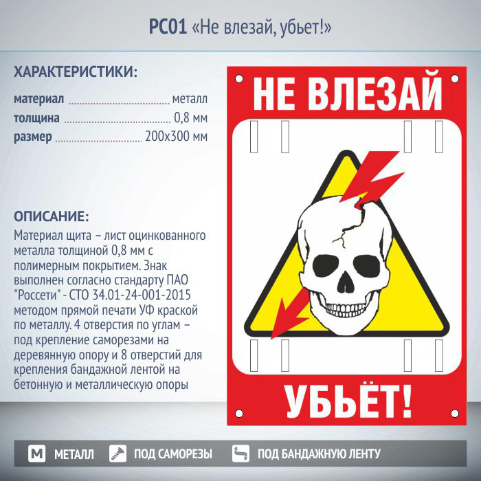 Знак «Не влезай, убьет!», РС01 (металл, 200х300 мм, отверстия под бандажную ленту) в Великом Новгороде купить