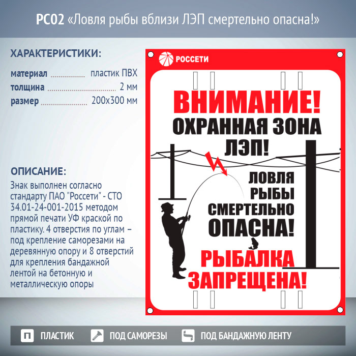 Знак «Ловля рыбы вблизи ЛЭП смертельно опасна!», РС02 (пластик 2 мм, 200х300 мм, отверстия под бандажную ленту) в Великом Новгороде купить