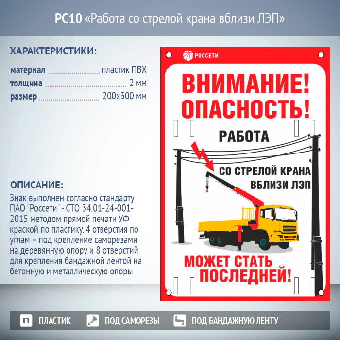 Знак «Работа со стрелой крана вблизи ЛЭП», РС10 (пластик 2 мм, 200х300 мм, отверстия под бандажную ленту) в Великом Новгороде купить