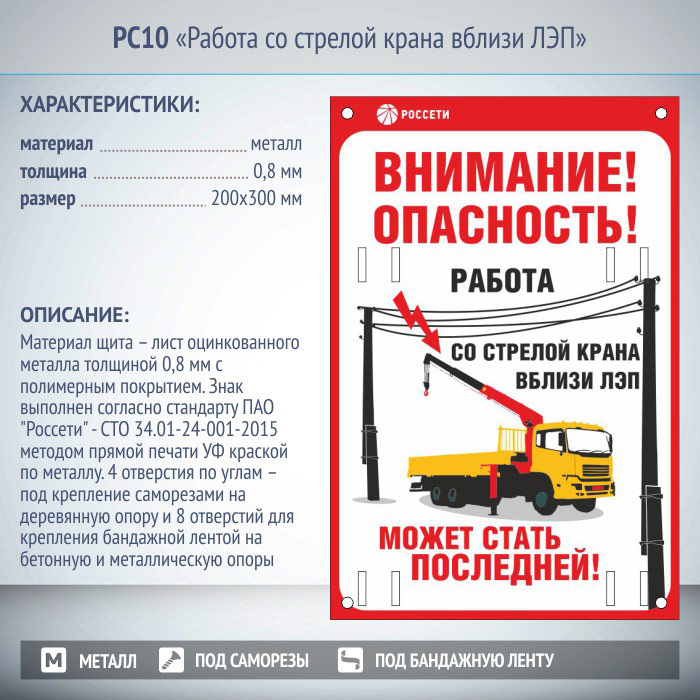 Знак «Работа со стрелой крана вблизи ЛЭП», РС10 (металл, 200х300 мм, отверстия под бандажную ленту) в Великом Новгороде купить