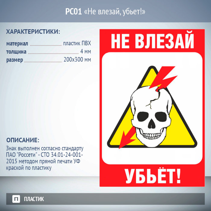 Знак «Не влезай, убьет!», РС01 (пластик 2 мм, 200х300 мм) в Великом Новгороде купить