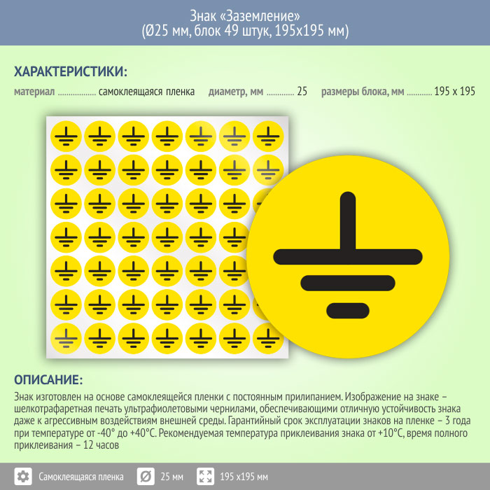 Знак (плакат) «Заземление», S46 (пленка, диаметр 25 мм, блок 49 штук, 195х195 мм) в Великом Новгороде купить