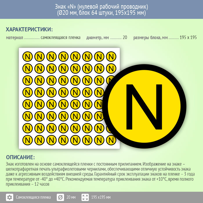 Знак (плакат) «N» (нулевой рабочий проводник), S47 (пленка, диаметр 20 мм, блок 64 штуки, 195х195 мм) в Великом Новгороде купить