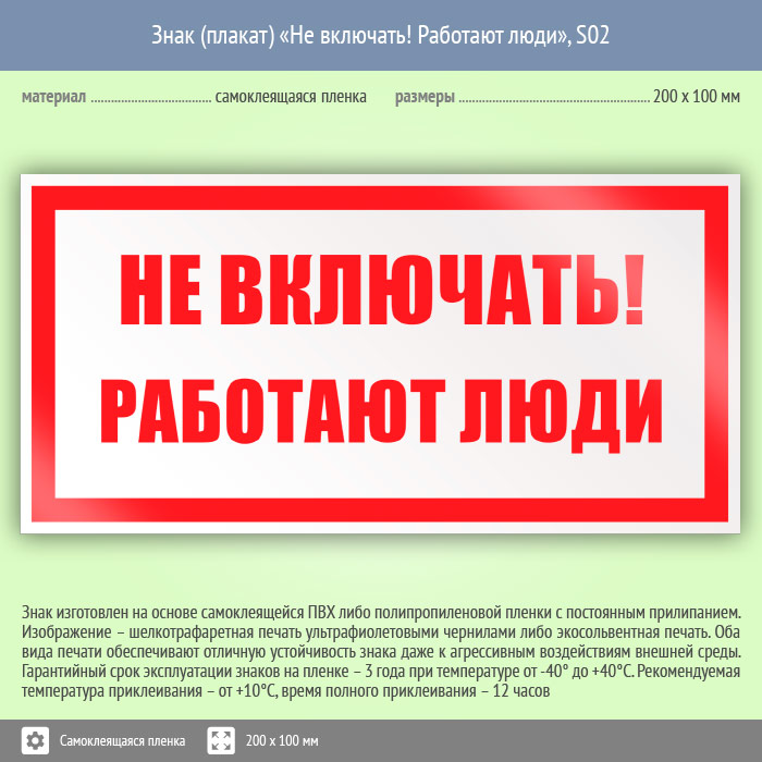 Знак (плакат) «Не включать! Работают люди», S02 (пленка, 200х100 мм) в Великом Новгороде купить