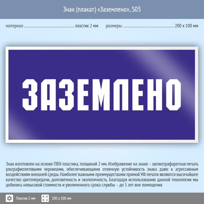 Знак (плакат) «Заземлено», S05 (пластик, 200х100 мм) в Великом Новгороде купить
