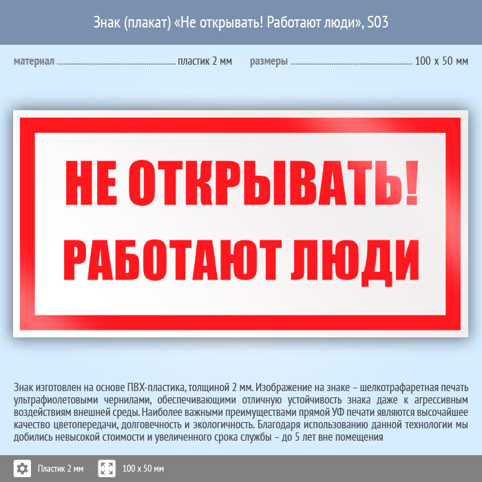 Знак (плакат) «Не открывать! Работают люди», S03 (пластик, 100х50 мм) в Великом Новгороде купить
