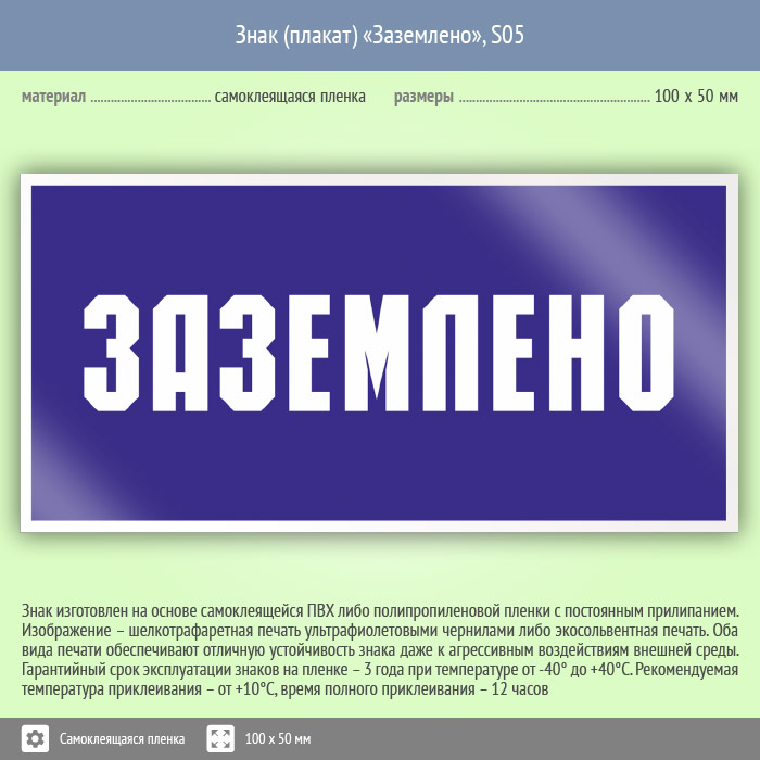 Знак (плакат) «Заземлено», S05 (пленка, 100х50 мм) в Великом Новгороде купить