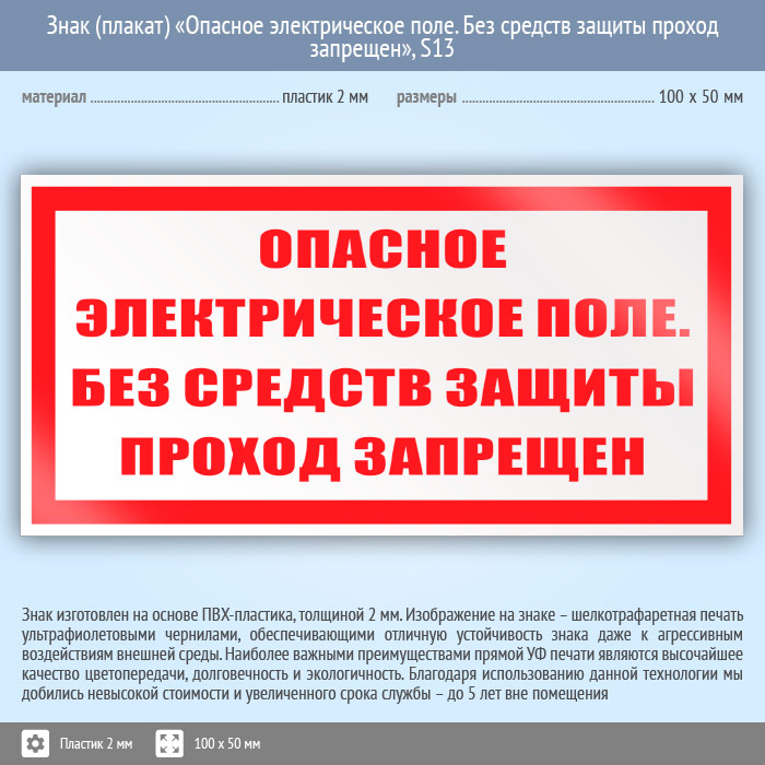 Знак (плакат) «Опасное электрическое поле. Без средств защиты проход запрещен», S13 (пластик, 100х50 мм) в Великом Новгороде купить