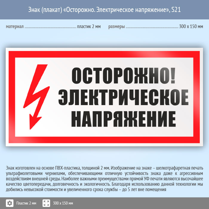 Знак (плакат) «Осторожно. Электрическое напряжение», S21 (пластик, 300х150 мм) в Великом Новгороде купить