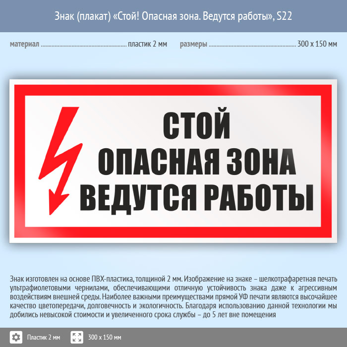 Знак (плакат) «Стой! Опасная зона. Ведутся работы», S22 (пластик, 300х150 мм) в Великом Новгороде купить