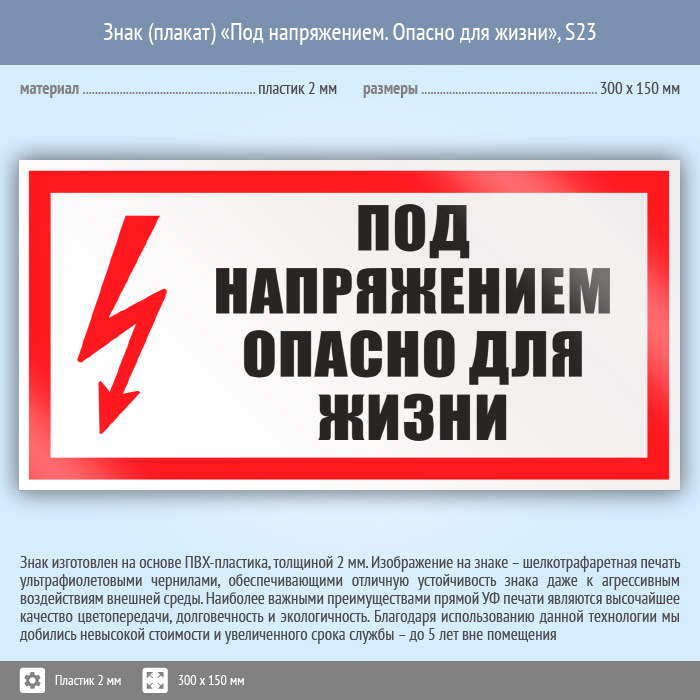Знак (плакат) «Под напряжением. Опасно для жизни», S23 (пластик, 300х150 мм) в Великом Новгороде купить