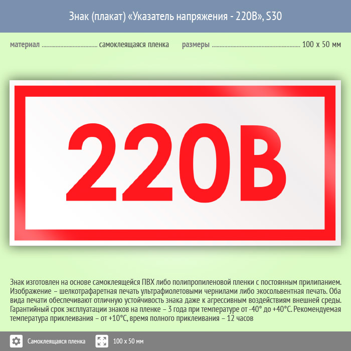 Знак (плакат) «Указатель напряжения - 220В», S30 (пленка, 100х50 мм) в Великом Новгороде купить