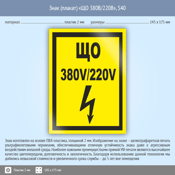 Знак (плакат) «ЩО 380В/220В», S40 (пластик, 145х175 мм) в Великом Новгороде купить