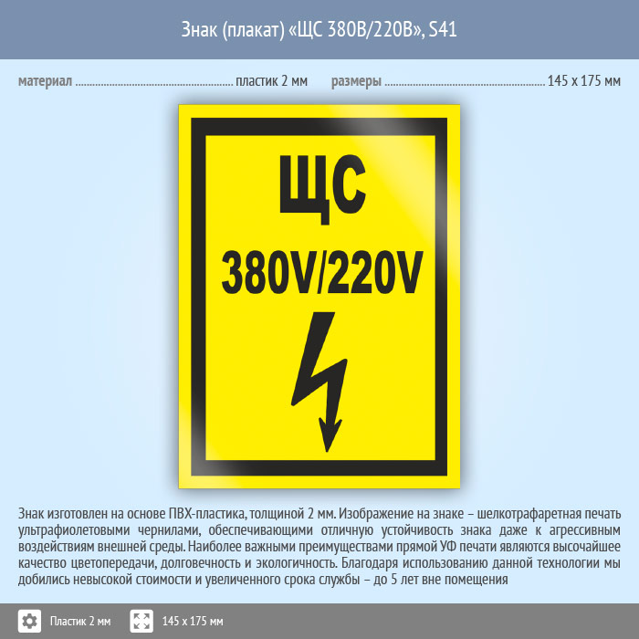 Знак (плакат) «ЩС 380В/220В», S41 (пластик, 145х175 мм) в Великом Новгороде купить