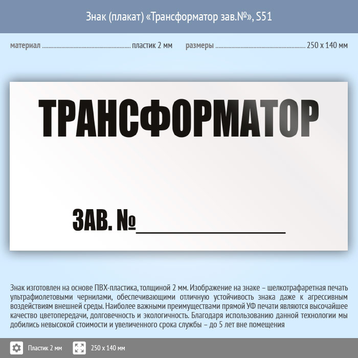 Знак (плакат) «Трансформатор зав.№», S51 (пластик, 250х140 мм) в Великом Новгороде купить