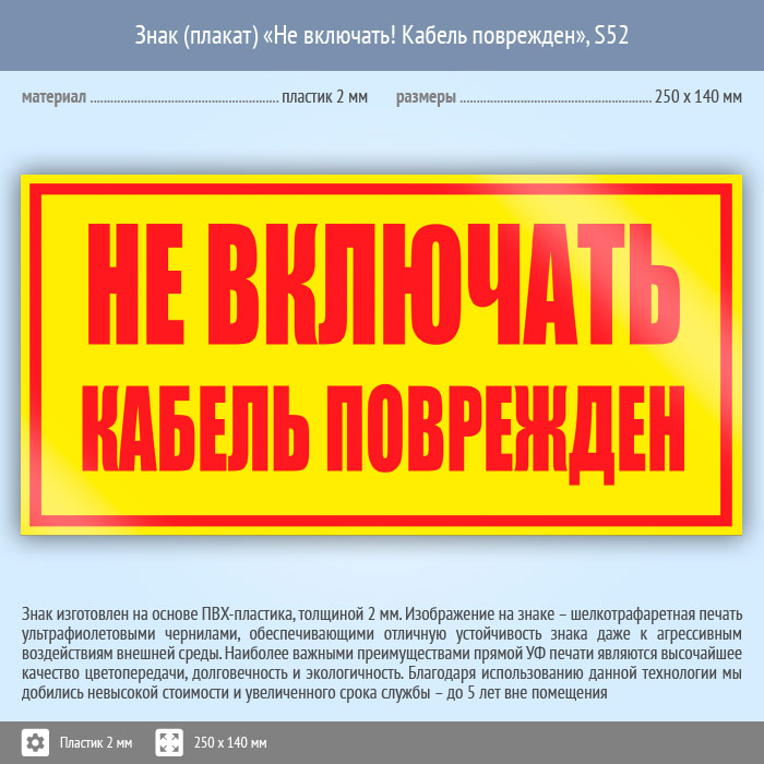 Знак (плакат) «Не включать! Кабель поврежден», S52 (пластик, 250х140 мм) в Великом Новгороде купить