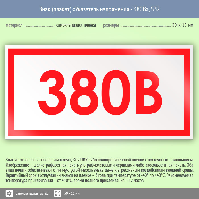 Знак (плакат) «Указатель напряжения - 380В», S32 (50 штук, пленка, 30х15 мм) в Великом Новгороде купить