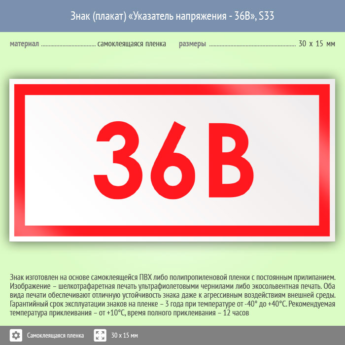 Знак (плакат) «Указатель напряжения - 36В», S33 (50 штук, пленка, 30х15 мм) в Великом Новгороде купить
