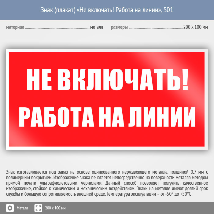 Знак (плакат) «Не включать! Работа на линии», S01 (металл, 200х100 мм) в Великом Новгороде купить
