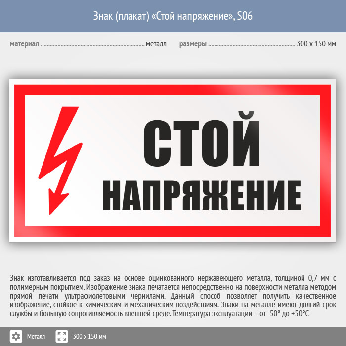 Знак (плакат) «Стой напряжение», S06 (металл, 300х150 мм) в Великом Новгороде купить