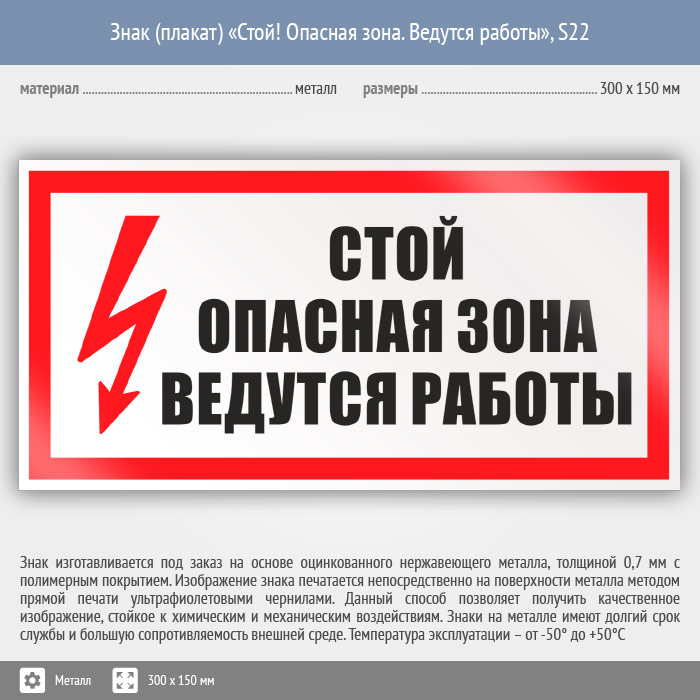 Знак (плакат) «Стой! Опасная зона. Ведутся работы», S22 (металл, 300х150 мм) в Великом Новгороде купить