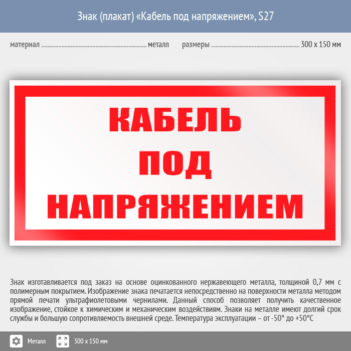Знак (плакат) «Кабель под напряжением», S27 (металл, 300х150 мм) в Великом Новгороде купить