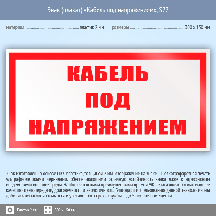 Знак (плакат) «Кабель под напряжением», S27 (пластик, 300х150 мм) в Великом Новгороде купить
