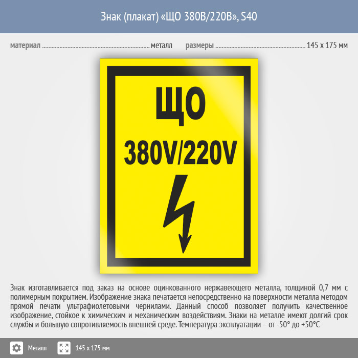 Знак (плакат) «ЩО 380В/220В», S40 (металл, 145х175 мм) в Великом Новгороде купить