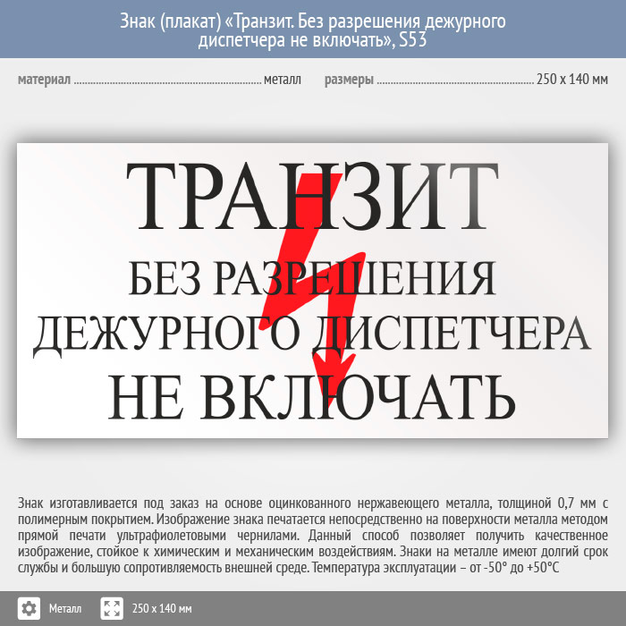 Знак (плакат) «Транзит. Без разрешения дежурного диспетчера Не включать», S53 (металл, 250х140 мм) в Великом Новгороде купить