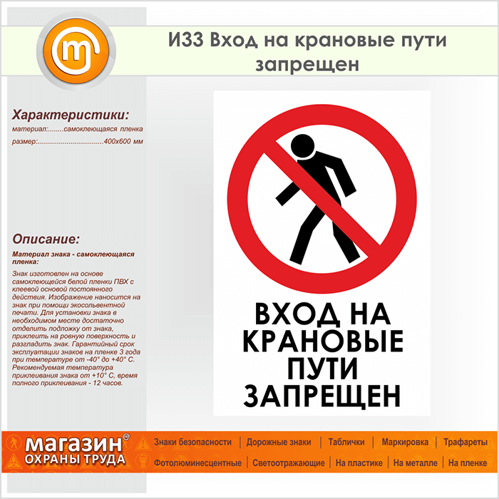 Знак «Вход на крановые пути запрещен», И33 (пленка, 400х600 мм) в Великом Новгороде купить