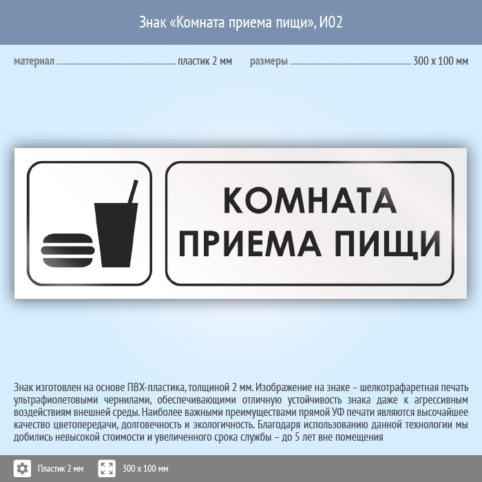 Знак «Комната приема пищи», И02 (пластик, 300х100 мм) в Великом Новгороде купить