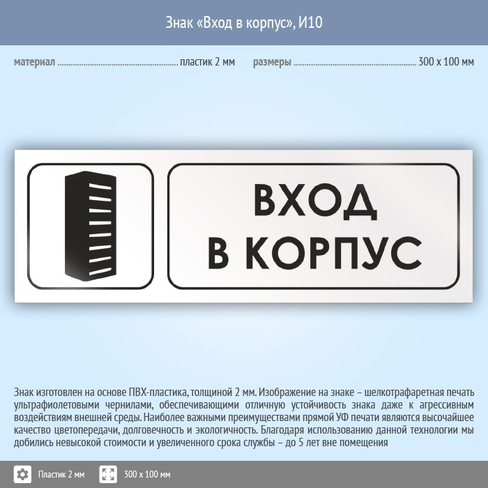 Знак «Вход в корпус», И10 (пластик, 300х100 мм) в Великом Новгороде купить
