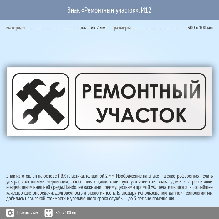 Знак «Ремонтный участок», И12 (пластик, 300х100 мм) в Великом Новгороде купить