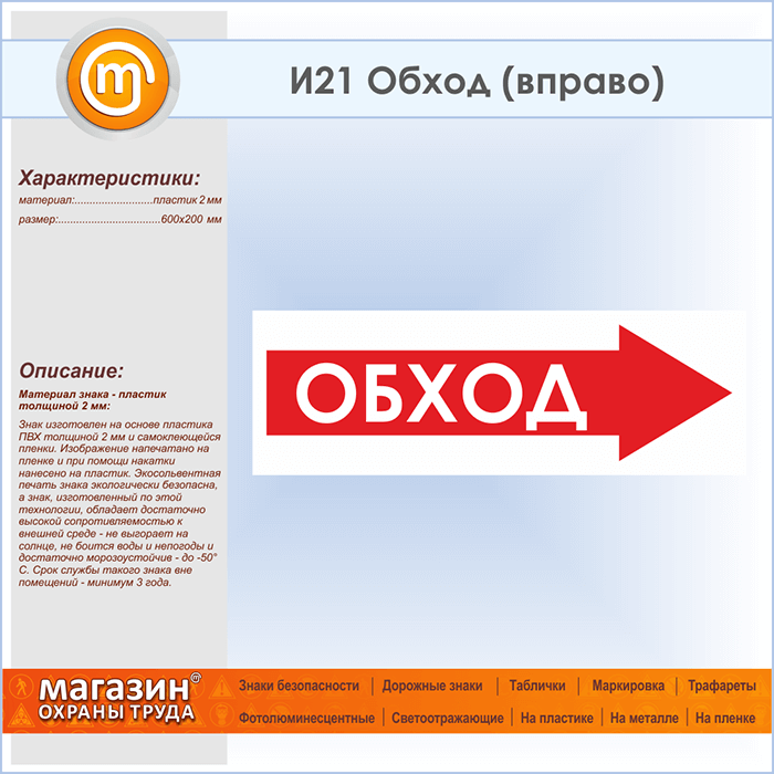 Знак «Обход (вправо)», И21 (пластик, 600х200 мм) в Великом Новгороде купить