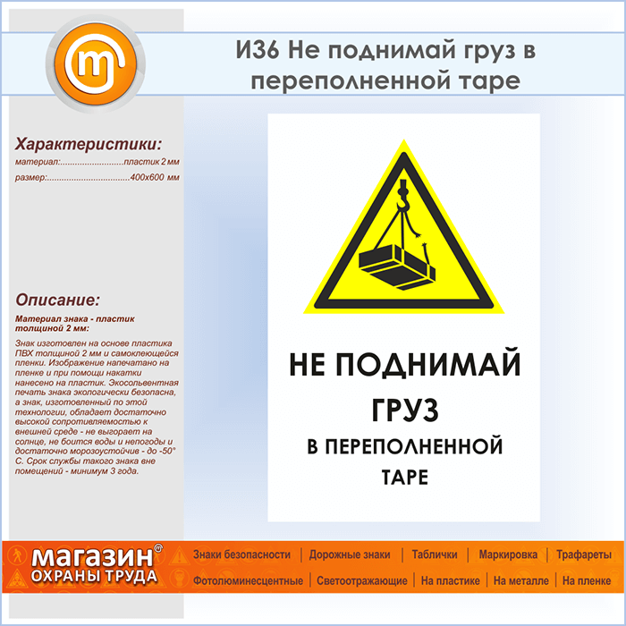 Знак «Не поднимай груз в переполненной таре», И36 (пластик, 400х600 мм) в Великом Новгороде купить