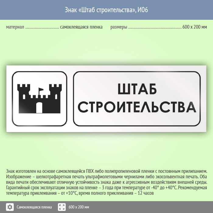 Знак «Штаб строительства», И06 (пленка, 600х200 мм) в Великом Новгороде купить