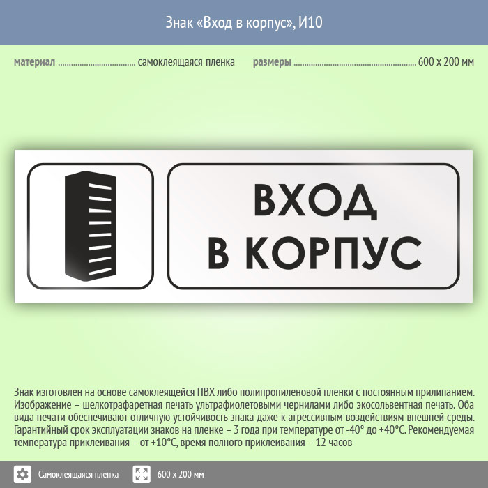 Знак «Вход в корпус», И10 (пленка, 600х200 мм) в Великом Новгороде купить