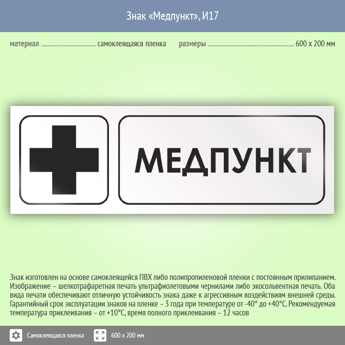 Знак «Медпункт», И17 (пленка, 600х200 мм) в Великом Новгороде купить