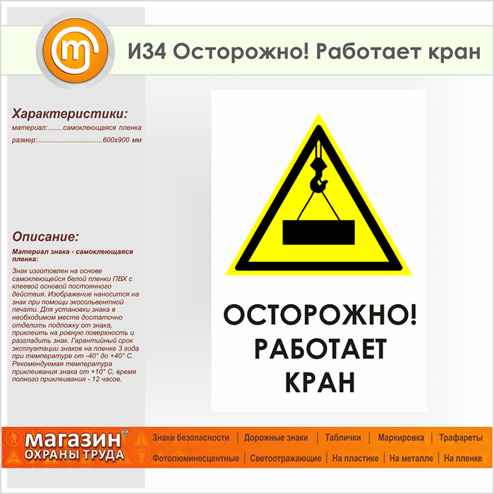 Знак «Осторожно! Работает кран», И34 (пленка, 600х900 мм) в Великом Новгороде купить
