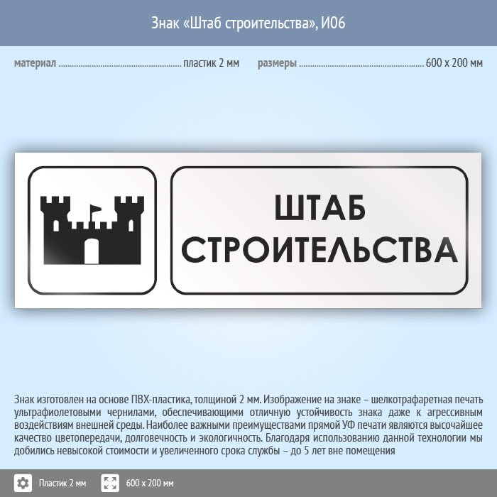 Знак «Штаб строительства», И06 (пластик, 600х200 мм) в Великом Новгороде купить